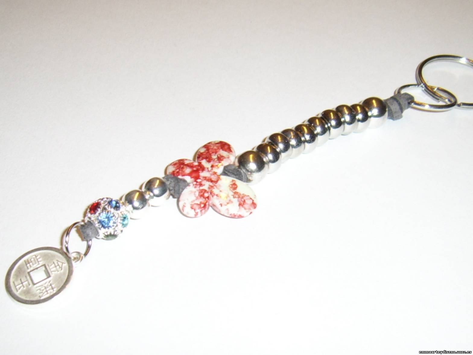 Llavero de Antelina gris, con cuentas de metal otros accesorios.
