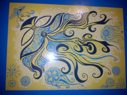 Dibujo en cartulina con rotuladores de gel, enmarcado.