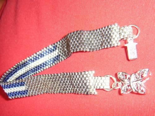 Pulsera de miyuki en plateado, plata vieja y azul con cierre de mariposa.