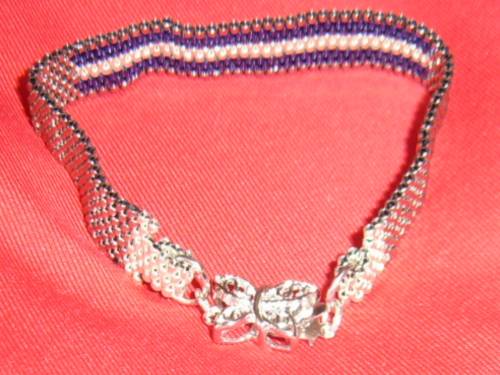Pulsera de miyuki en plateado, plata vieja y azul con cierre de mariposa.