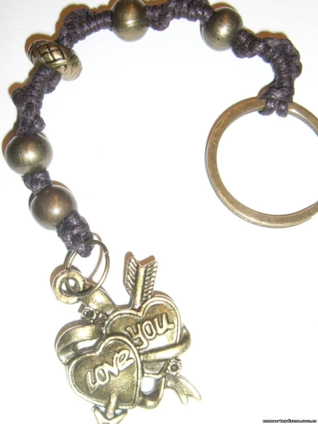Llavero de cuero marron, con cuentas y acesorios de metal de color oro viejo.