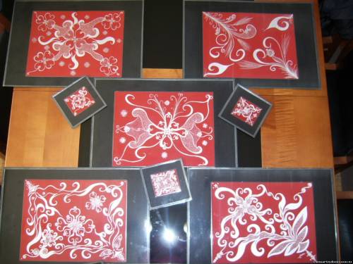 Manteles individuales+ posavasos, hechos con rotuladores de gel. todos plastificados y forrados por debajo.